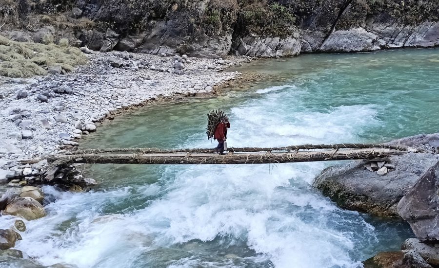 पिठ्युमा दाउराको भारी र हातमा पानीको बोतलसँगै जोखिमपूर्ण काठको लाप्को (काठको पुल) पार गरेर घर र्फकँदै गरेकी डोल्पाको मुड्केचुला गाउँपालिकास्थित मालुवाकुना बस्ने स्थानीय वृद्ध महिला । झोलङ्गे पुल नहुँदा स्थानीयहरु दैनिक जोखिम मोलेर आवतजावत गर्ने गर्दछन् । तस्वीर- रामचन्द्र न्यौपाने/रासस