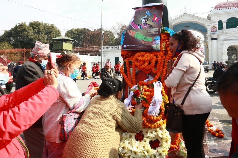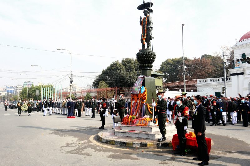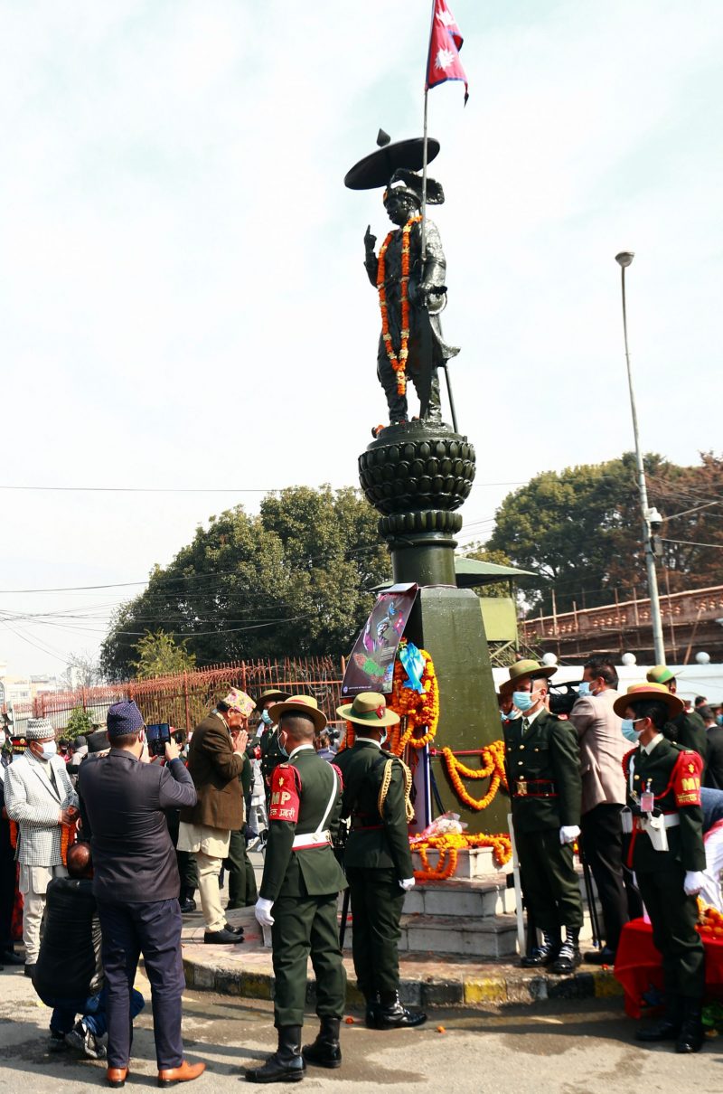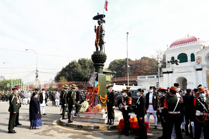 आज पुस २७ गते मङ्गलबार सिंहदरबारस्थित पृथ्वीनारायण शाहका शालिकमा राष्ट्रपति विद्यादेवी भण्डारीले पुष्पार्पण गर्दै श्रद्धाञ्जली व्यक्त गर्नुभयो भने विभिन्न दलका नता तथा आम सर्वसाधारणले पनि श्राञ्जली व्यक्त गरेका छन् । सोही समारोहका केही झलकहरु तस्वीरमा