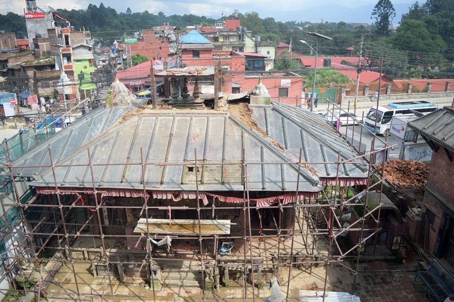 सडकमा रहेको मन्दिर पुनःनिर्माणका लागि चुना सुर्कीको लागत अनुमानसहित कोषले २०७५ माघमा तुलसी कन्स्ट्रक्सनसँग दुई वर्षमा पुनःनिर्माण सक्ने गरी सम्झौता गरिएको थियो । सम्झौता अनुसार मन्दिर पुनःनिर्माणका लागि भत्काउने क्रममा तीन गजुरसहितको भित्री मन्दिर, भैरवसहित विभिन्न देवीदेवताका भित्तेचित्र लगायत संरचना भेटिएको थियो ।
