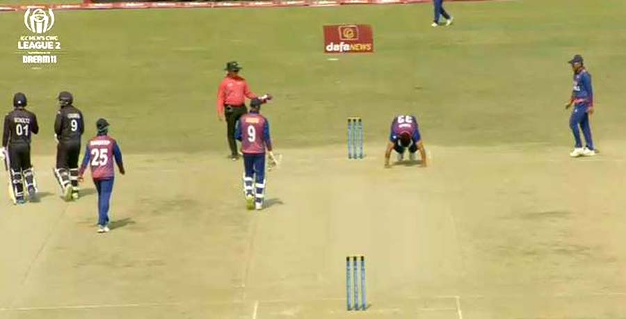 नेपालका लागि सन्दीप लामिछनेले ३ विकेट लिए भने कुशल मल्ल र सोमपाल कामीले समान ११ विकेट लिए । केहीबेरमा नेपालले जवाफी ब्याटिङ गर्नेछ ।