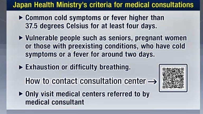 जापान सरकारले कोरोना भाइरसबाट संक्रमित हुनसक्ने सम्भाविवत मानिसको स्वास्थ्य परामर्श तथा उपचारका लागि नयाँ मापदण्ड घोषणा गरेको छ ।