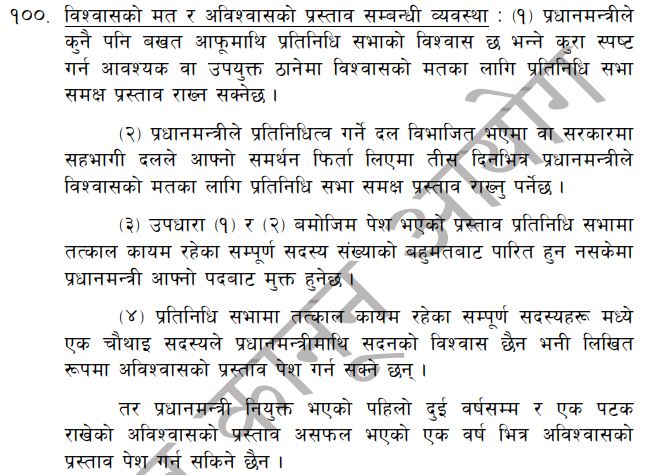 नेपालको संविधान विधानको धारा १०० को उपधारा २ मा प्रधानमन्त्रीले प्रतिनिधित्व गर्ने दल विभाजित भएमा वा सरकारमा सहभागी दलले आफ्नो समर्थन फिर्ता लिएमा ३० दिनभित्र प्रधानमन्त्रीले विश्वासको मतका लागि प्रतिनिधिसभा समक्ष प्रस्ताव राख्नुपर्ने व्यवस्था रहेको छ ।
