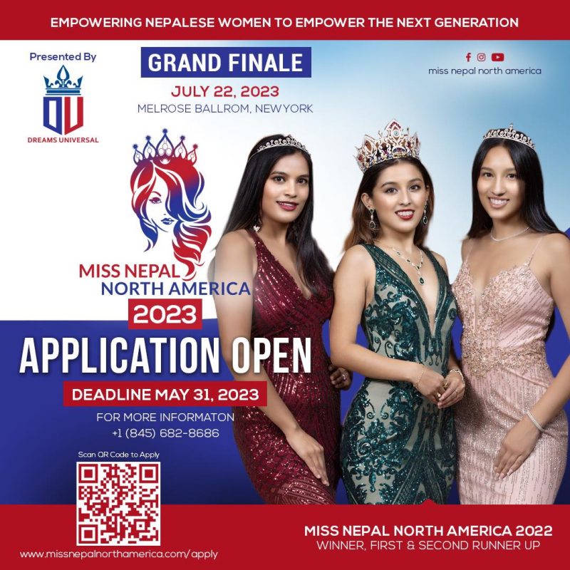 हरेक वर्ष संयुक्त राज्य अमेरिकाको न्यूयोर्कमा हुँदै आएको मिस नेपाल नर्थ अमेरिका २०२३ को आवेदन खुला गरिएको छ । फेब्रुअरी २८ देखि खुला गरिएको आवेदन दिने अन्तिम मिति मे ३१, २०२३ सम्म रहेको छ ।