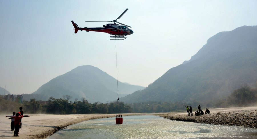 आगो निभाउन मादीबाट पानी ओसार्दै हेलिकप्टर