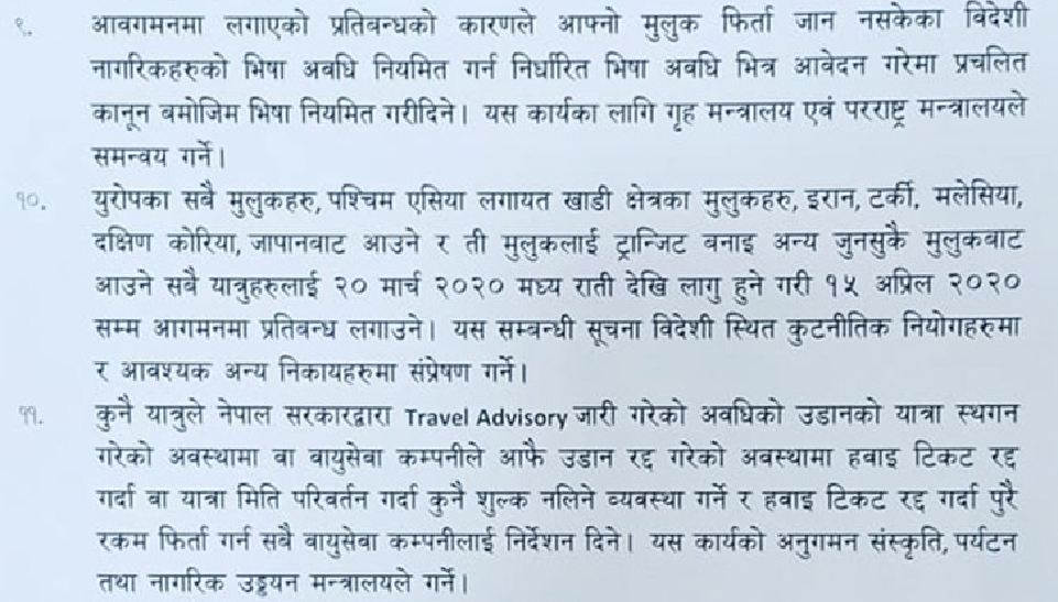 यात्रा प्रतिबन्ध लागेका बखत नेपालमा रहेका विदेशीहरु आफ्नो मुलुक फिर्ता जान नसक्ने भएकाले उनीहरुको भिसा अवधि नियमित गर्न निर्धारित भिसा अवधिभित्र आवेदन गरेमा प्रचलित कानुन बमोजिम भिसा नियति गरिदिने निर्णय पनि सरकारले गरेको छ ।