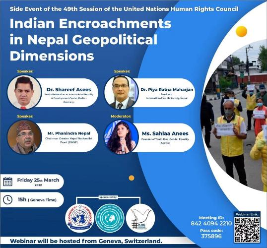 संयुक्त राष्ट्रसंघ मानवअधिकार परिषद्को ४९ औं सत्रको साइड इभेन्टका रूपमा मार्च २५ तारिखमा सञ्चालित उक्त जूम वेबिनारमा अन्तर्राष्ट्रिय सुरक्षा तथा विकास केन्द्र, बर्लिनका वरिष्ठ अनुसन्धाता डा. सरिफ असिस, अन्तर्राष्ट्रिय युवा समाज, नेपाल का सभापति डा. पिया रत्न महर्जन र ग्रेटर नेपाल राष्ट्रवादी मोर्चाका अध्यक्ष फणीन्द्र नेपाल वक्ताका रूपमा सहभागी थिए