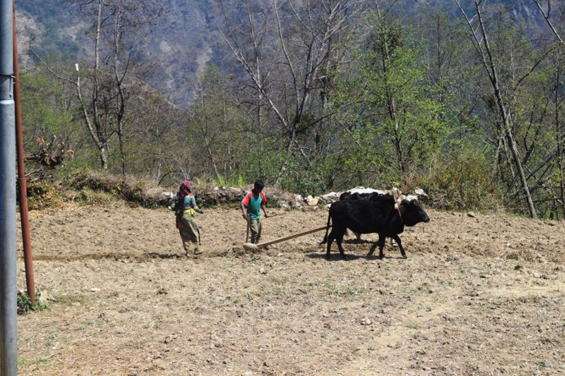 आफ्नै खेतबारीमा श्रम गरेर कृषि कर्म गर्ने युवाहरु विदेशिएपछि रित्तिएका गाउँघरमा खेतबारी समेत बालकले जोत्नुपरेको छ । म्याग्दीको मालिका गाउँपालिका–५ देविस्थानमा मकै छर्नका लागि बारी जोत्दै गरेका बालक । तस्वीर- कमल खत्री, रासस