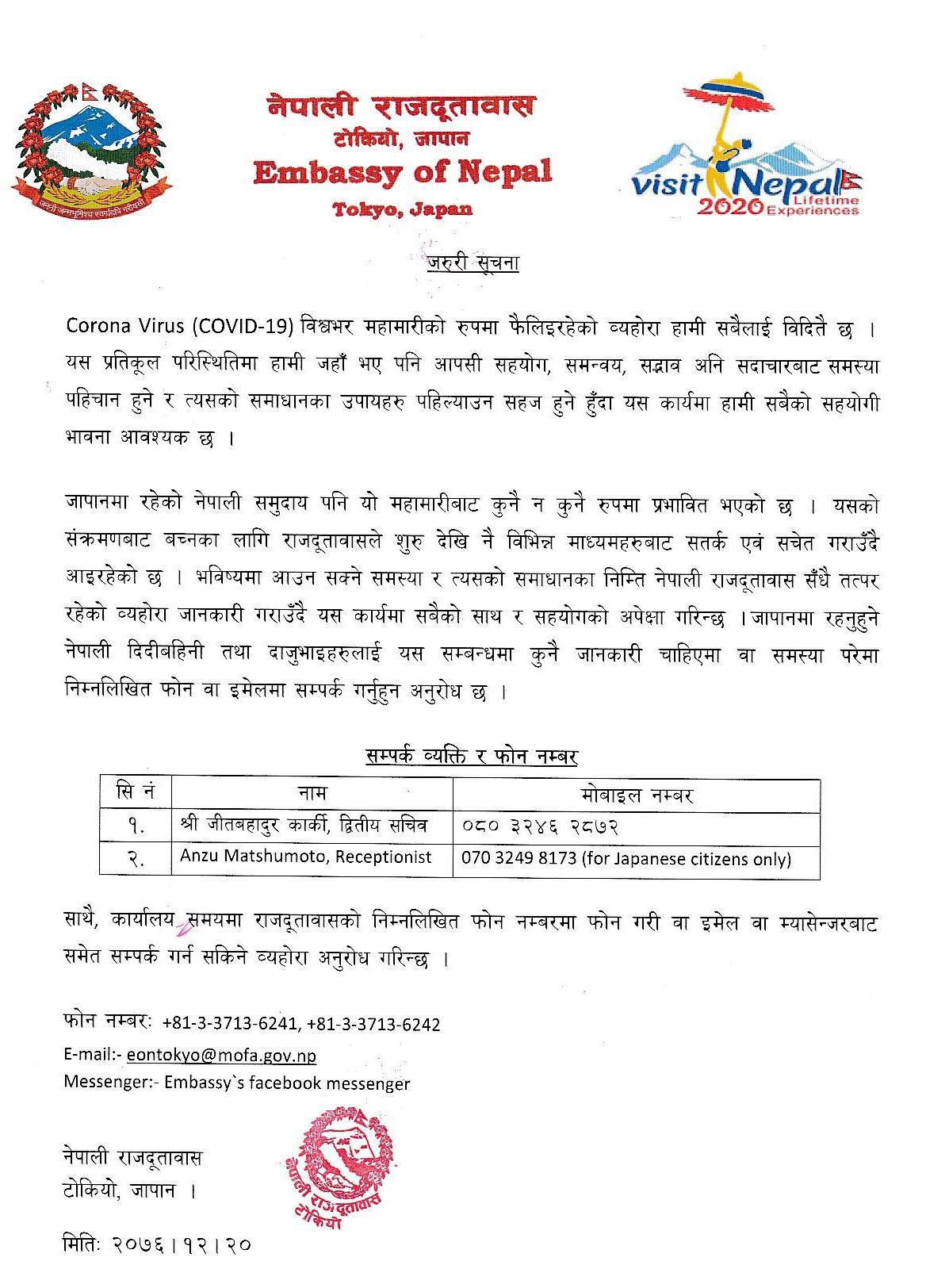विश्वभर महामारीको रुपमा फैलिएको कोरोना संक्रमणबाट बच्न र बचाउन सबैको सहयोग, समन्वय सदभावबाट मात्र सम्भव हुने भन्दै जापानमा रहेका नेपालीहरु पनि कुनै न कुनै रुपमा प्रभावित भएको भन्दै आवश्यक सहयोगका लागि हटलाइनन सेवा सुरु गरेकोा जनाइएको हो ।