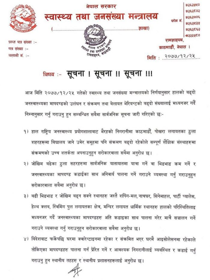 मन्त्रालयका सह–प्रवक्ता डा. समीरकुमार अधिकारीले बुधबार सूचना जारी गरी स्वास्थ्य सुरक्षा मापदण्ड पालना नगर्नेलाई संक्रामक रोग ऐन बमोजिम कारबाही गर्ने गरी घरबाहिर र सार्वजनिक स्थामा मास्कको प्रयोगलाई अनिवार्य गराउन पनि सबै जिल्ला प्रशासन कार्यालयलाई आग्रह गरेको छ ।