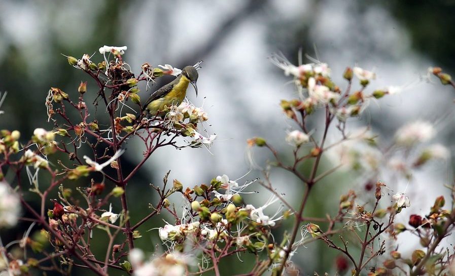 सुनसरीको इनरुवा नगरपालिका–२ मा फूलको रस खान तयार रहेको पोथी कालो बुङ्गे चरा (पर्पल सनबर्ड) । सानो तर सबैभन्दा फुर्तिलो चरामध्ये एक यो चराले मौरीजस्तै एकै ठाउँमा स्थिर रहेर फूलको रस चुस्न सक्छ । तस्बिर- नवीन गड्तौला/रासस