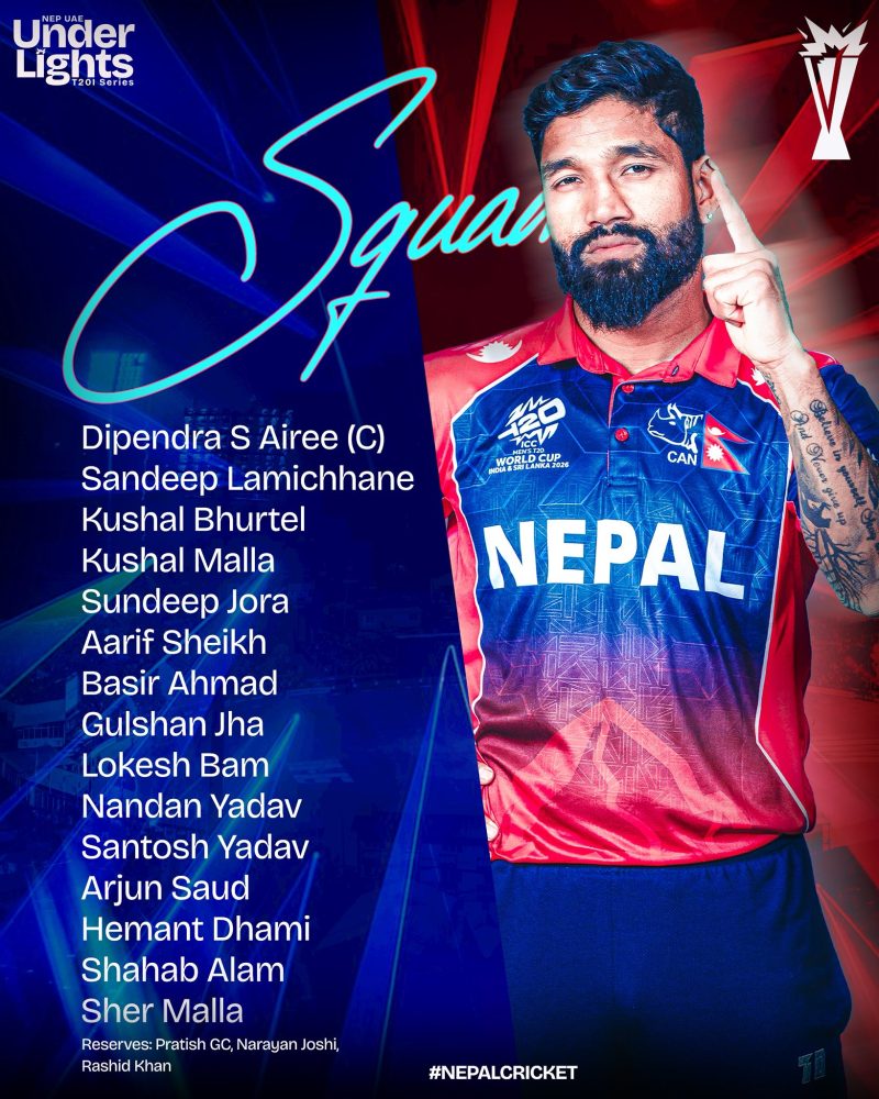 सोमबार र मंगलबार हुने युएईविरुद्धको टी-२०आई सिरिजका लागि नेपाली टोलीको घोषणा भएको छ । शुक्रबार नेपाल क्रिकेट संघ(क्यान) ले दीपेन्द्रसिंह ऐरीको कप्तानीमा १५ सदस्यीय नेपाली टोलीको घोषणा गरेको हो ।