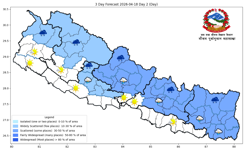 जल तथा मौसम पूर्वानुमान महाशाखाका अनुसार कोशी प्रदेशलगायत बागमती र गण्डकी प्रदेशका हिमाली र पहाडी भू–भागका थोरै स्थानहरुमा तथा लुम्बिनी प्रदेशको पहाडी र हिमाली भू–भागलगायत कर्णाली र सुदूरपश्चिम प्रदेशका हिमाली भू–भागका एक–दुई स्थानमा मेघगर्जन/चट्याङ्ग सहित हल्का वर्षा/हिमपातको सम्भावना रहेको छ ।
