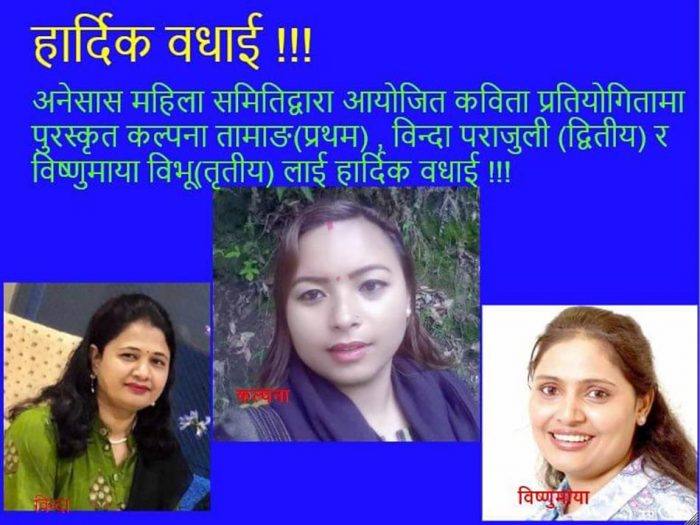 विश्व महिला खुल्ला कविता प्रतियोगिताको उपाधी अमेरिका निवासी कल्पना तामाङले वितेकी छिन । अन्तर्राष्ट्रिय नेपाली साहित्य समाज (अनेसास) महिला समितिद्वारा आयोजित कविता प्रतियोगितामा उपाधीसंगै उनले पाँचयस डलर नगद पुरस्कार समेत हात पारिन ।
