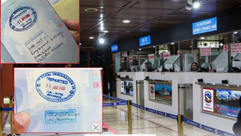 अध्यागमन विभागले संयुक्त अरब इमिरेट्स (युएई) जान लागेका नेपालीको राहदानीमा अनधिकृत रुपमा काम गर्न निषेध गरिएको व्यहोरा लेख्ने दुई जना अधिकृतलाई जिम्मेवारीबाट हटाएर अनुसन्धान गरिरहेको जनाएको छ ।