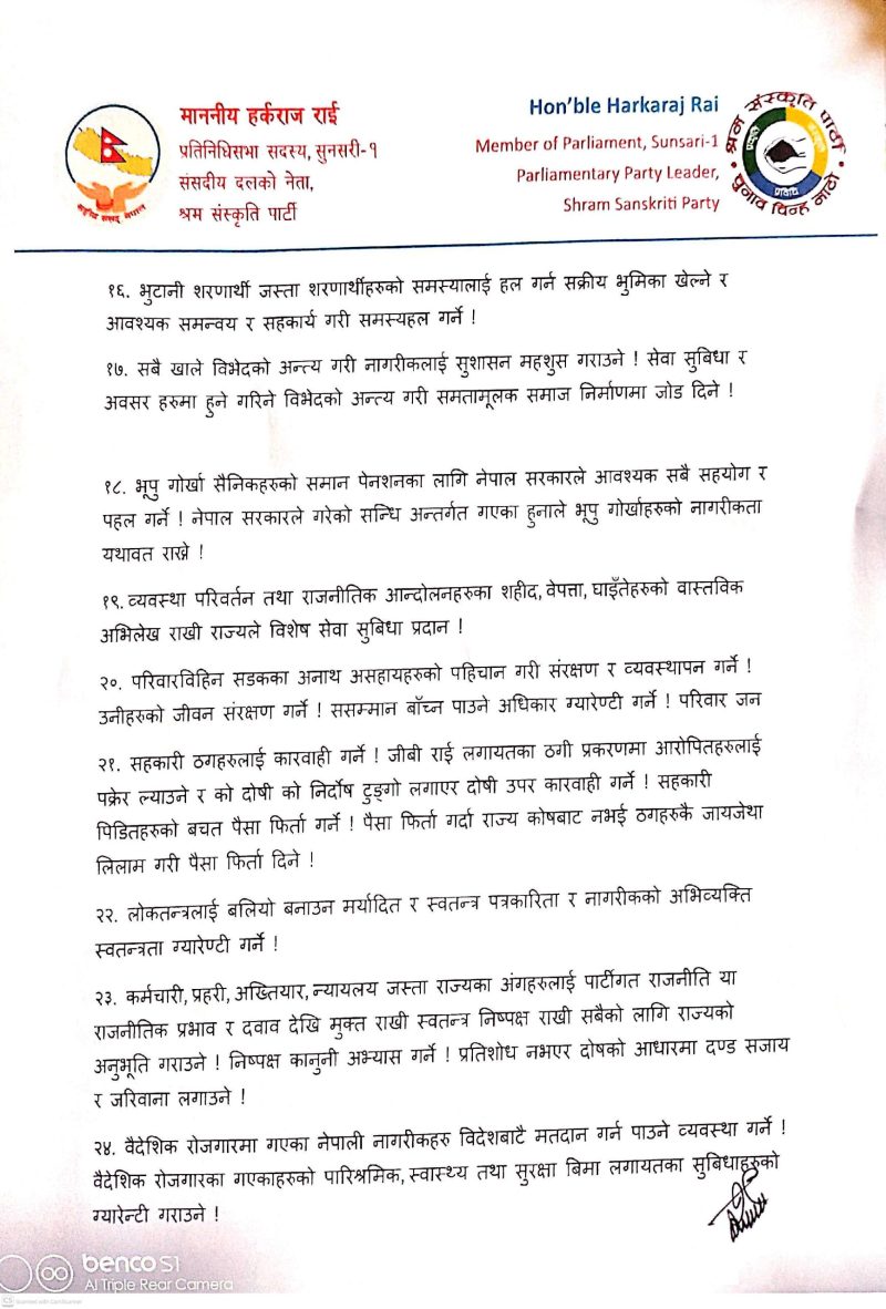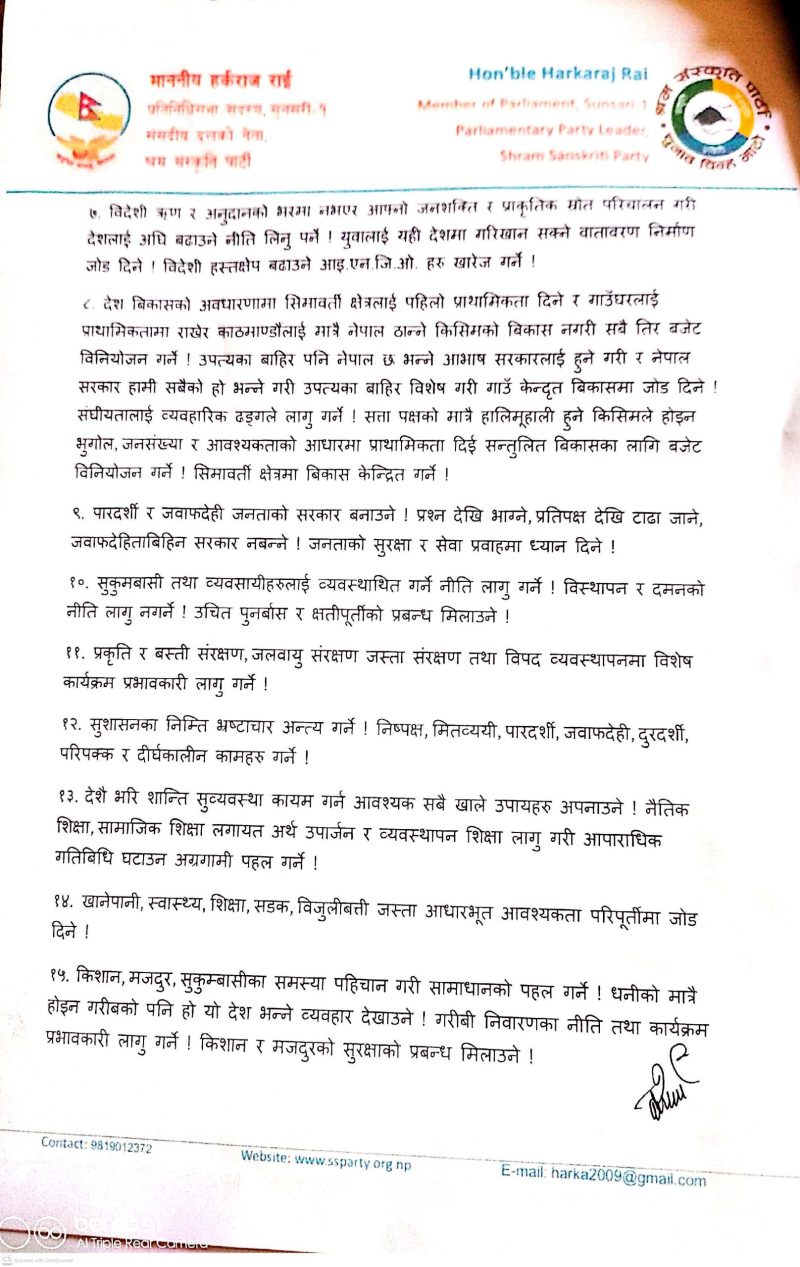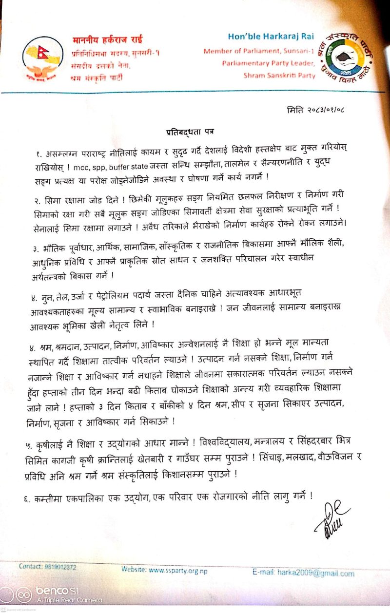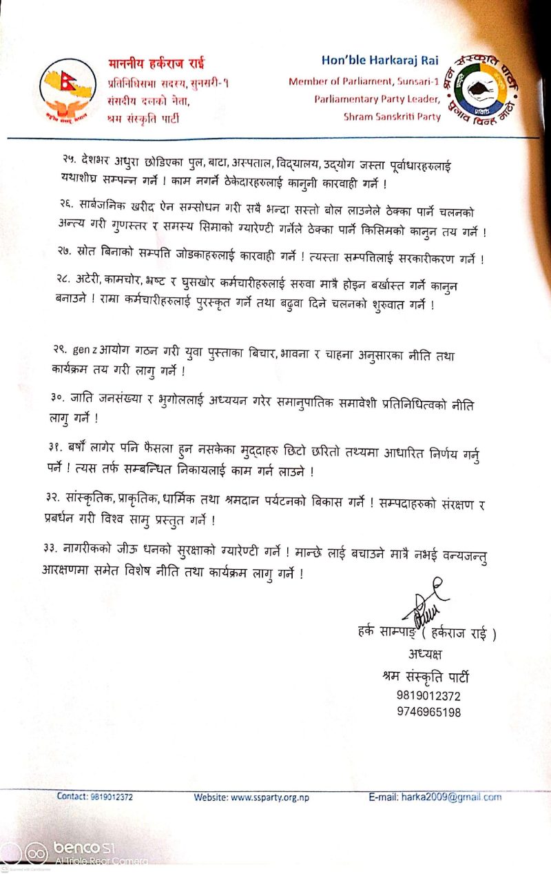 श्रम संस्कृति पार्टीका अध्यक्ष हर्कराज राई (हर्क साम्पाङ) ले देशको समग्र विकास, सुशासन र स्वाधीनताका लागि ३३ बुँदे सुझावसहितको प्रतिबद्धता पत्र सार्वजनिक गर्नुभएको छ ।