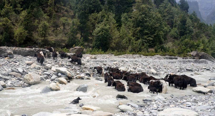 खोला तरेर चरन क्षेत्रतर्फ जाँदै याक चौँरी