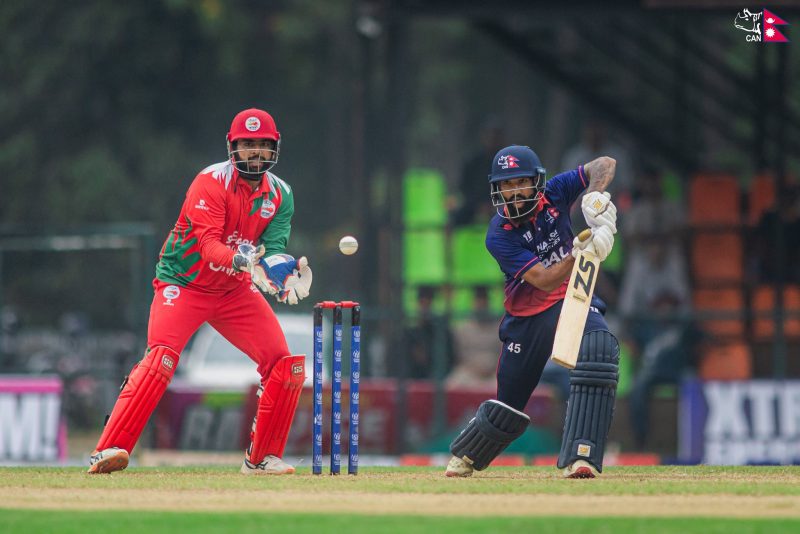 त्यस्तै आर्यन विष्टले ३५ रन जोड्दा हमाद मिर्जाले ३०, विनायक शुक्लाआशिष ओडेदराले समान २३-२३ रन बनाए । नेपालको लागि सोमपाल कामीले चार विकेट लिए भने सन्दीप लामिछाने,र दीपेन्द्रसिंह ऐरीको भागमा समान दुई-दुई विकेट रह्यो । ओमानले दिएको ३०६ रनको लक्ष्य लिएर मैदान उत्रेको नेपालले ३६ दशमलव ५ ओभरमा ७ विकेट गुमाएर १ सय ५५ रन बनाएपछि वर्षाका कारण रोकिएको थिए ।