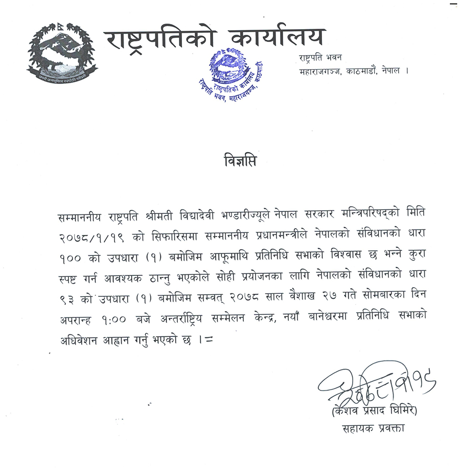 राष्ट्रपति भण्डारीले नेपालको संविधानको धारा १०० को उपधारा १ बमोजिम ‘प्रधानमन्त्रीले आफूमाथि विश्वासको मत छ भन्ने कुरा स्पष्ट गर्न आवश्यक ठान्नुभएकाले सोही प्रयोजनका लागि’ सो दिन अपराह्न १ बजे अन्तरराष्ट्रिय सम्मेलन केन्द्र, नयाँ बानेश्वरमा प्रतिनिधिसभाको अधिवेशन आह्वान गर्नुभएको राष्ट्रपतिको कार्यालयका सहायक प्रवक्ता केशवराज घिमिरेले जारी गरेको विज्ञप्तिमा उल्लेख छ ।