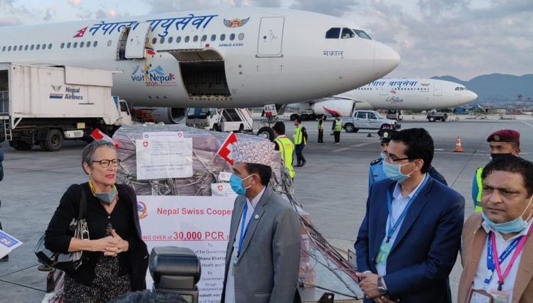 पीसीआर टेस्ट किटसहित स्वीटजरल्याण्ड सरकार विकास सहयोग एसडीसीले गरेको अन्य स्वास्थ्य सामग्री नेपाल वायु सेवा निगमको वाइडबडी विमानमार्फत नेपाल आइपुगेको हो ।