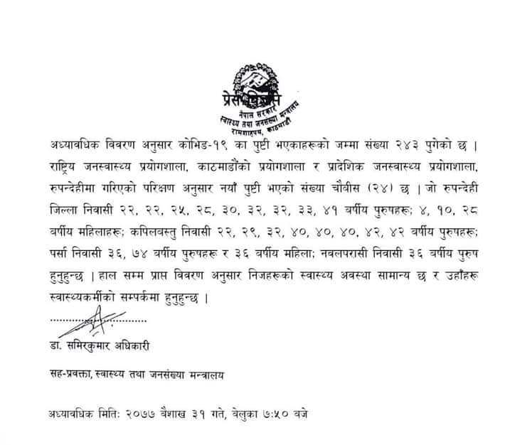नेपालमा कोरोना संक्रमितको संख्या दुई सय ४३- बुधबार भेटिए २६ जना