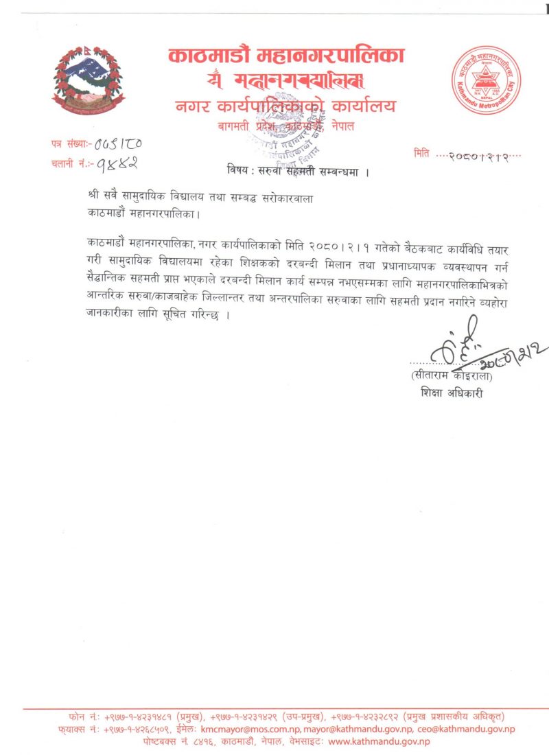 शिक्षा अधिकारी सीताराम कोइरालाद्वारा जारी विज्ञप्तिमा तत्काललाई महानगरपालिकाभित्रको आन्तरिक सरुवा, काज बाहेक अन्य सरुवाका लागि सहमति नदिने उल्लेख गरिएको छ ।