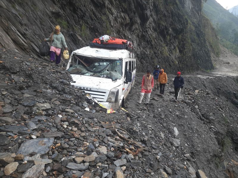 म्याग्दीको अन्नपूर्ण गाउँपालिका–२ गुइठे भिरमा पहिरोले पुरिएको गाडी । पहिरोका कारण आइतबार बिहानदेखि बेनी–जोमसोम सडक अवरुद्ध भएको छ । तस्बिर- सन्तोष गौतम/रासस