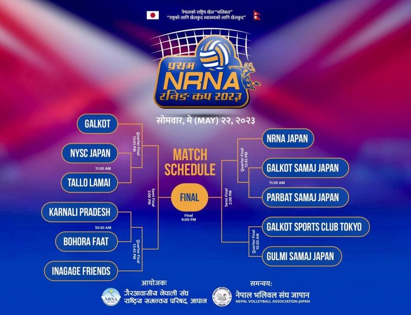 एनआरएनए जापानले ईतिहासकै पहिलोपल्ट आयोजना गरेको पुरुष भलिबल प्रतियोगिता भोलि मे २२ बिहान ९ बजेबाट सुरु हुँदैछ ।