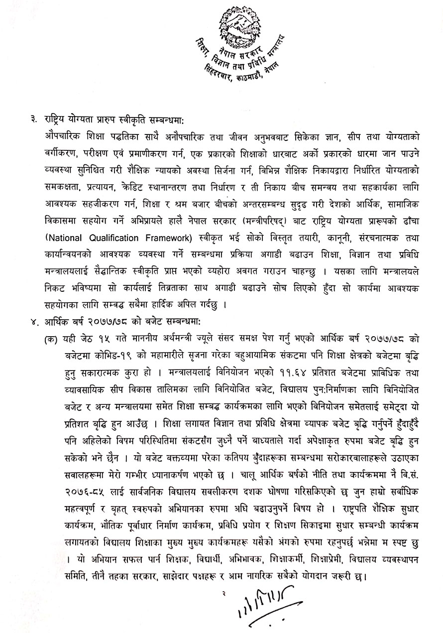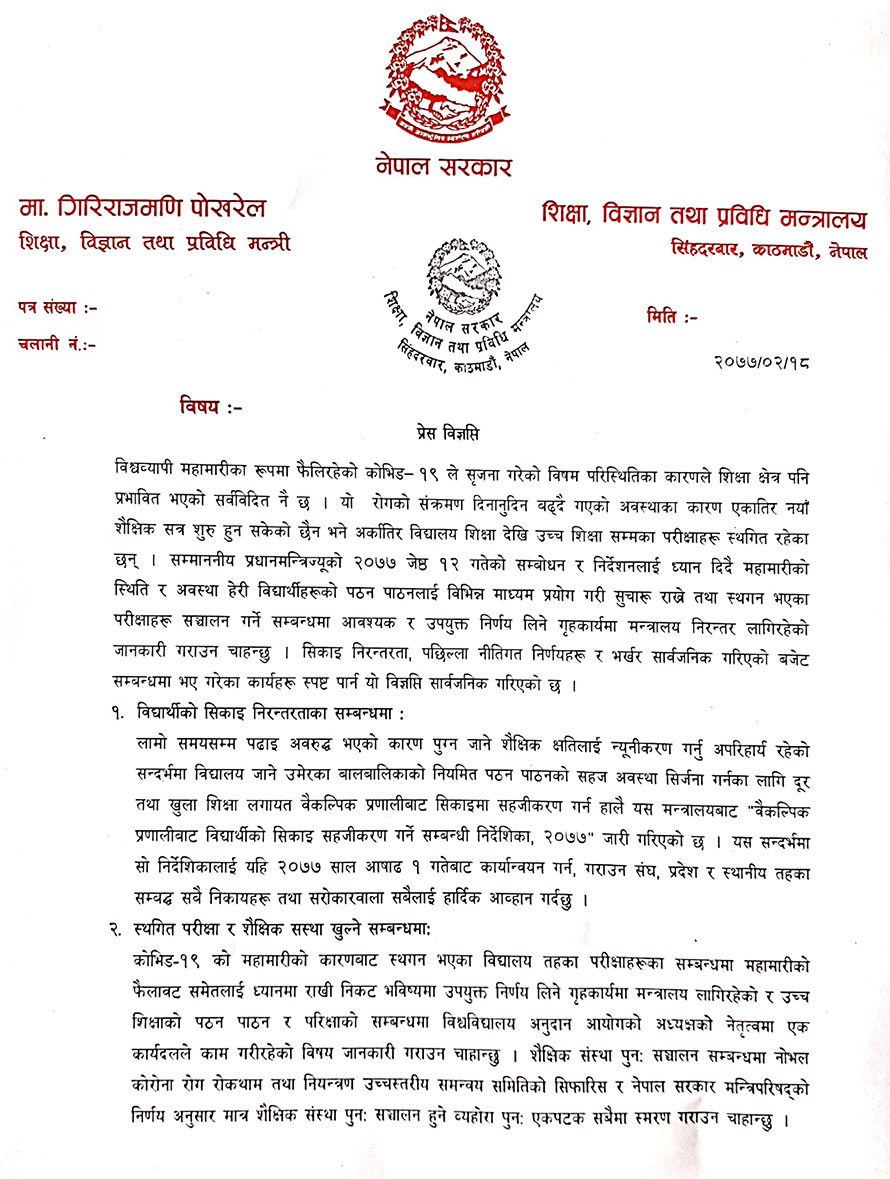 त्यसै गरी एसइई तथा ११ र १२ को परीक्षा र कक्षा संचालनका सम्बन्धमा विभिन्न कार्यदलले अध्ययन गरिरहेको बताउँदै उच्चस्तरीय समितिको सिफारिशमा मन्त्रिपरिषद्को निर्णय अनुसार मात्र परीक्षा र कक्षा संचालन हुने स्पष्ट गर्नुभएको छ ।
