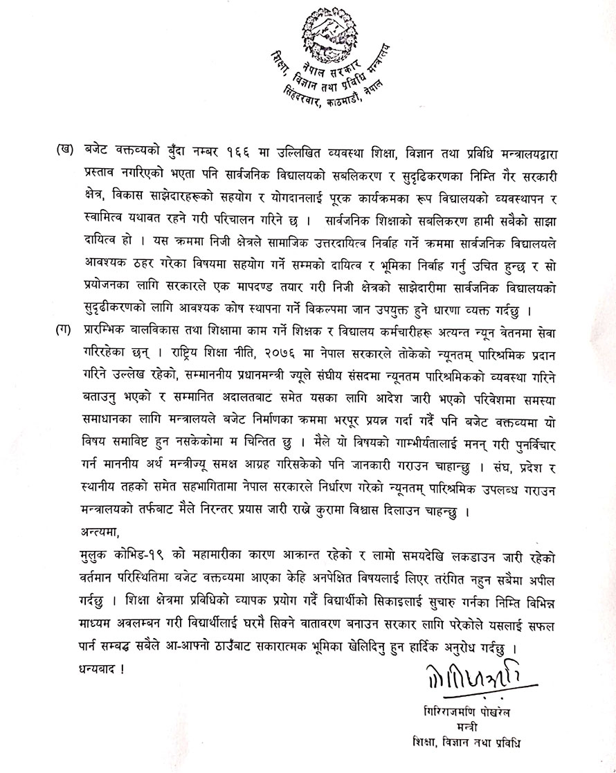 विज्ञप्तिमा उहाँले बजेटको बुँदा नम्बर १६६ मा उल्लेखित व्यवस्था शिक्षा, विज्ञान तथा प्रविधि मन्त्रालयबाट प्रस्ताव नगरिएको भएता पनि सार्वजनिक विद्यालयको सवलीकरण र सुदृढीकरणका लागि गैर सरकारी क्षेत्र, विकास साझेदारहरूको सहयोग तथा योगदानलाई पुरक कार्यक्रमको रूपमा विद्यालय व्यवस्थापन र स्वामित्व यथावत रहने गरी कोष परिचालन गरिने बताउनुभएको छ ।
