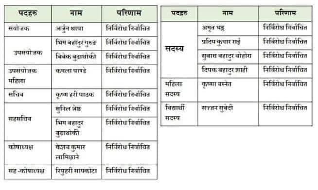 यस्तै सदस्यहरुमा अमृत भट्ट, प्रदिपकुमार राई, सुबास बहादुर बोहरा, दिपक बहादुर शाही महिला सदस्यमा कृष्णा बस्नेत र बिद्यार्थी सदस्यमा सञ्जन सुबेदी निर्बिरोध निर्वाचित भएको हो ।