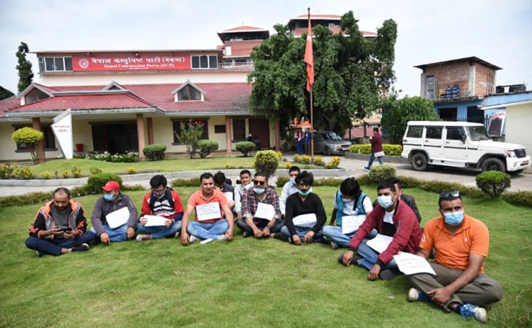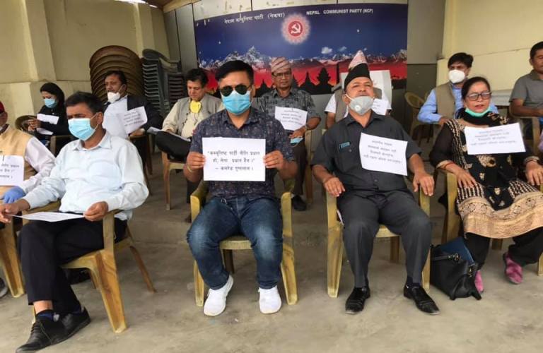 सत्तारुढ नेपाल कम्युनिस्ट पार्टी (नेकपा)काभित्र देखिएको विवाद पार्टी विभाजनको संघारमा पुगेपछि केन्द्रीय सदस्यहरु शीर्ष नेतृत्वलाई एकताको पक्षमा लाग्न दवाव दिंदै पार्टी कार्यालय धुम्बाराहीमा धर्नामा बसेका छन् ।