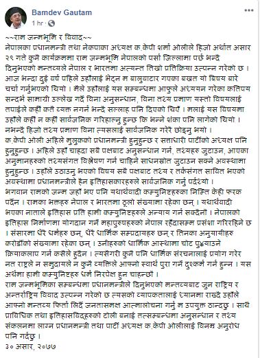 प्रधानमन्त्री केपी शर्मा ओलीले सोमबार राम जन्मभूमि अयोध्याका विषयमा दिएको अभिव्यक्ति प्रमाणित विषय नभएकाले फिर्ता लिनुपर्ने माग सत्तारुढ नेकपा उपाध्यक्ष बामदेव गौतमले गर्नुभएको छ । मंगलबार फेसबुकमार्फत उपाध्यक्ष गौतमले राम जन्मभूमि अयोध्या नेपालमा पर्ने भनी प्रधानमन्त्रीले दिएको अभिव्यक्तिबाट राष्ट्रिय अन्तर्राष्ट्रिय विवाद सिर्जना भएकाले फिर्ता लिँदै जनतासमक्ष आत्मआलोचना गर्नु उपयुक्त हुने सुझाव दिनुभएको हो ।