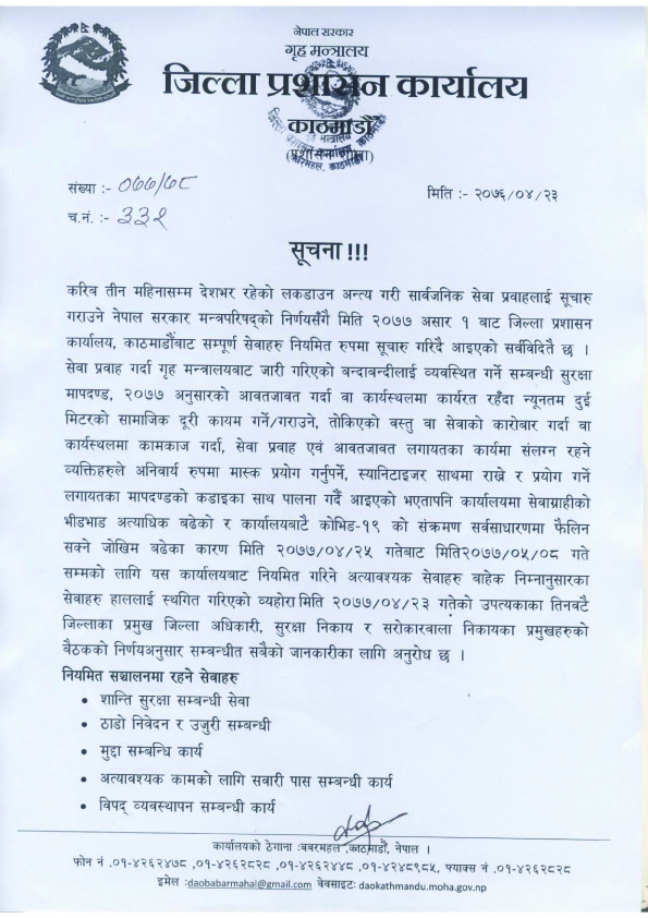 यस्तै, शान्ति सुरक्षा सम्बन्धी सेवा, ठाडो निवेदन र उजुरी सम्बन्धी, मुद्दा सम्बन्धी कार्य, अत्यावश्यक कामको लागि सवारी पास सम्बन्धी कार्य र विपद् व्यवस्थापन सम्बन्धी कार्य भने सञ्चालन गर्ने निर्णय भएको छ ।