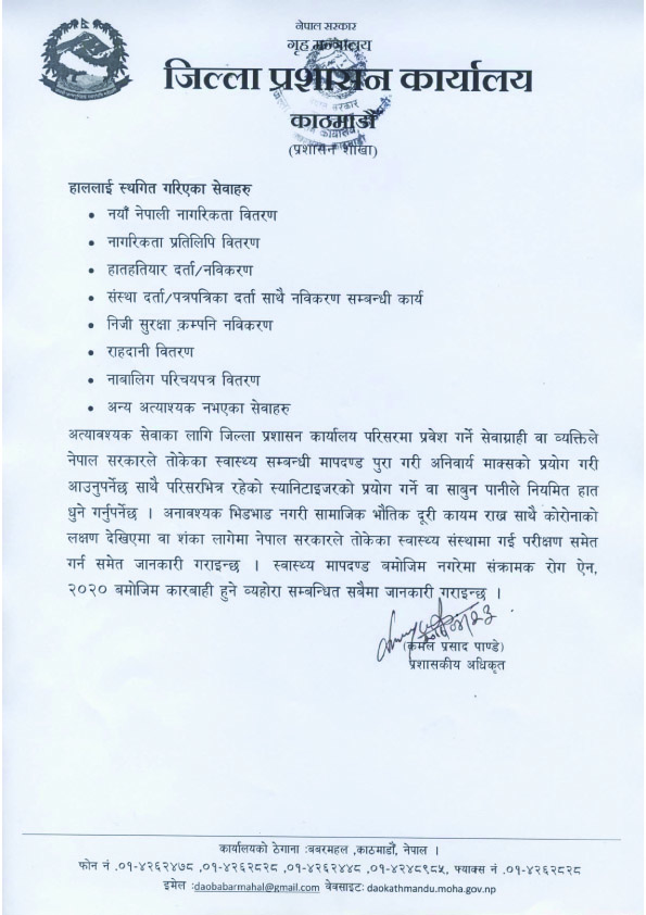 शुक्रबार काठमाडौं उपत्यकाका तीनवटै जिल्लाका प्रमुख जिल्ला अधिकारीहरुको बैठकले कोरोना संक्रमण फैलनन नदिन कार्यालयबाट प्रवाह भैरहेका नियमित कामहरु रोकेर अत्यावश्यक मात्र गर्ने सूचना जारी गरेका छन् । साउन २५ गते आइतबारबाट भदौ ८ गतेसम्म तीनवटै जिल्ला प्रशासन कार्यालयका अत्यावश्यकबाहेकका सेवा बन्द हुने भएका छन् ।