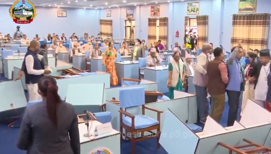 प्रमुख प्रतिपक्षी दल नेपाली कांग्रेसका सासदहरुले प्रदेश नम्बर ५ को प्रदेशसभामा तोडफोड गरेका छन् । बैठकको प्रारम्भमै अबरोध गरेपछि केही समयका लागि स्थगित बैठक पुनः संचालन हुँदा विपक्षी दल नेपाली कांग्रेसले नाराबाजीसहित प्रदर्शन गर्नुका साथै तोडफाुड गरेका छन् ।