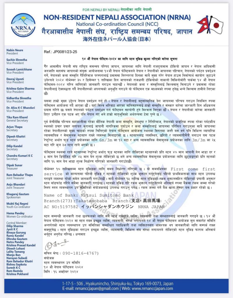 गैरआवासीय नेपाली संघ, जापानस्थित नेपाली दूतावास र नेपाल आदिवासी जनजाति महासंघकाो आयोजनामा हुने नेपाल फेस्टिवलको स्टल बुकिङ सम्बन्धी पूर्ण विवरण यसप्रकार छ—
