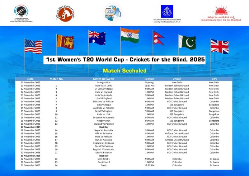 नेपाली टोलीले नोभेम्बर १५ तारिखमा इङ्ल्याण्ड र नोभेम्बर १६ मा अमेरिकासँग प्रतिस्पर्धा गर्नेछ । यी सबै खेल भारतमा नै हुनेछ । त्यसपछि नेपाली टोली श्रीलङ्का पुगेर नोभेम्बर १८ मा अस्ट्रेलिया र नोभेम्बर १९ मा पाकिस्तानसँग खेल्नेछ ।