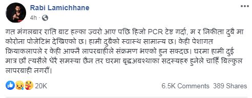 लामिछानेले गत मंगलबार रातिबाट हल्का ज्वरो आएपछि हिजो पिसिआर परीक्षण गर्दा म र निकिता दुबैमा कोरोना पोजेटिभ देखिएको छ र आफूहरूको स्वास्थ्य सामान्य रहेको उल्लेख गरेका छन् ।