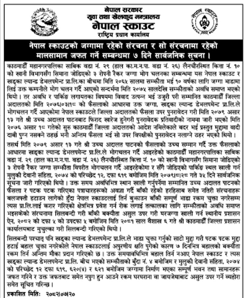 सूचनामा भनिएको छ, “सात दिनभित्र बहालको बक्यौता रकम तिर्न अन्तिम मौका प्रदान गरिएको छ। उक्त समयावधिभित्र बहाल तिर्न नआए नेपाल स्काउट र खड्का ल्याण्ड डेभलपमेन्ट प्रालिबीच भएको सम्झौताको बुँदा ४ बमोजिम र मुलुकी देवानी संहिता, २०७४ को परिच्छेद १२ दफा ६१९, ६२० ९४० र ६२१ बमोजिम जग्गामा निर्माण भएका सम्पूर्ण भवन तथा सामानहरू जफत गरिने र उक्त जफतबाट समेत नपुग हुन आउने रकम घरजग्गा वा जायजेथाबाट असुल–उपर गर्ने व्यहोरा समेत सूचित गरिन्छ ।”