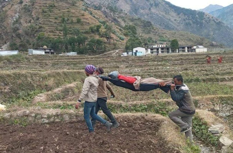 तस्वीरमा देखिएको दृश्य बझाङको हो । जिल्लाका ग्रामीण क्षेत्रका एक शारीरिक अशक्तता भएका व्यक्तिलाई भत्ता बुझ्नका लागि स्थानीय बैङ्कतर्फ लगिंदैछ ।