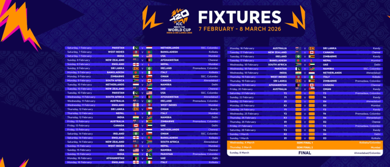 प्रतियोगिता भारत र श्रीलंकाका ७ शहरका ८ स्टेडियममा हुनेछ । टी-२० विश्वकप फेब्रुअरी ७ देखि मार्च ८ सम्म हुनेछ ।नेपालले तेस्रो पटक विश्वकपको यात्रा तय गरेको हो । यसअघि नेपालले सन् २०१४ र सन् २०२४ को विश्वकप खेलेको थियो ।