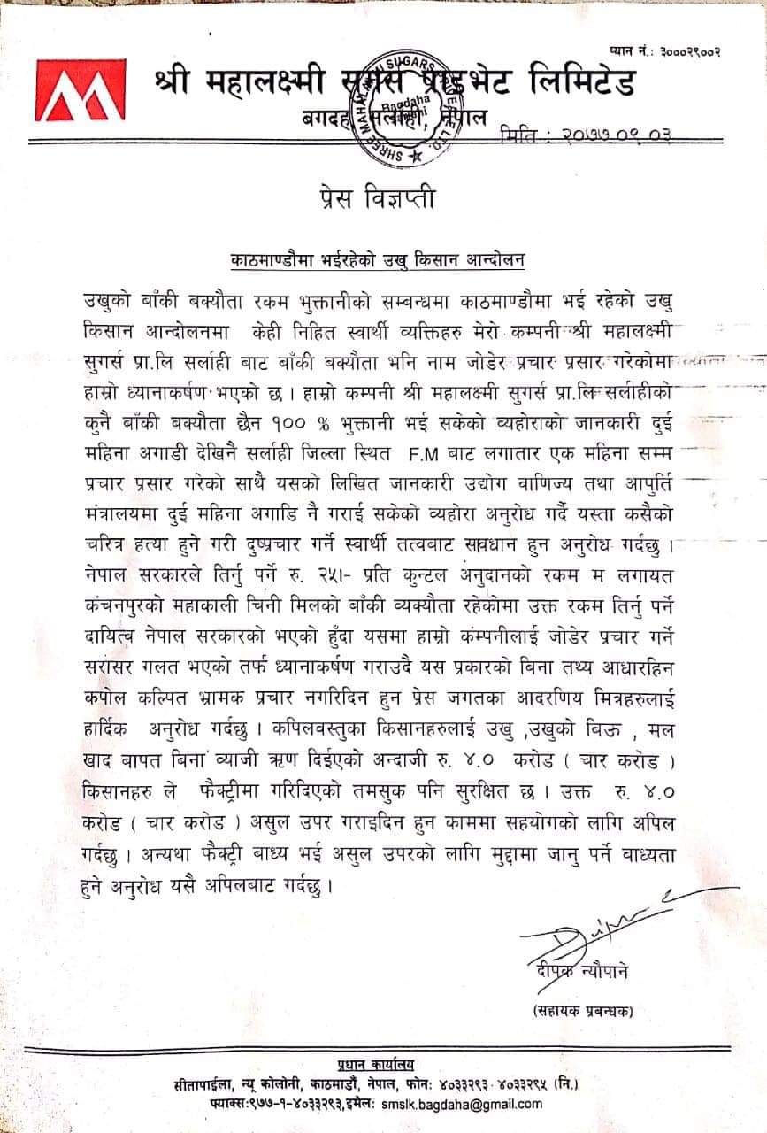 विज्ञप्तिमा सरकारले प्रतिक्वीन्टल २५ रुपैयाँका दरले दिनुपर्ने अनुदान रकम प्रालिले नपाएको अवस्थामा काठमाडौंमा चलिरहेको उखु किसानको आन्दोलनलाई लिएर प्रालिले पनि किसानलाई रकम नतिरेको प्रचार सरासर गलत भएको दावी गरेको छ ।