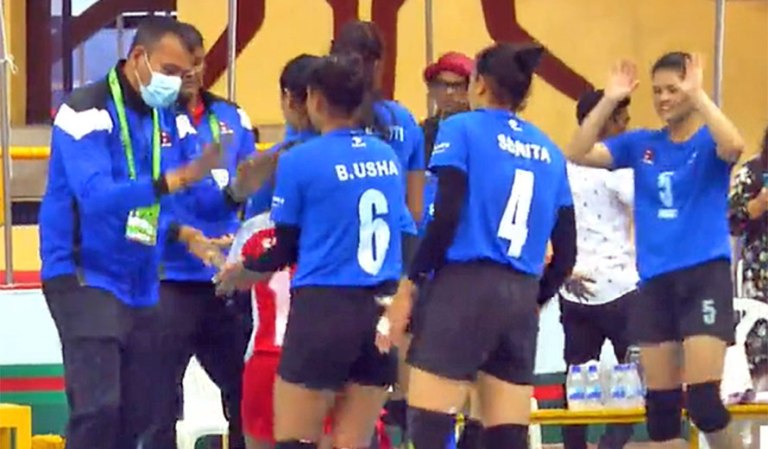 शुक्रबार भएको खेलमा नेपालले कपक्षीय जस्तै बनेको खेलमा माल्दिभ्सलाई २५-११, २५-९, २५-५ सेटमा हराउँदै अंक तालिकामा शीर्ष स्थानमा रहेको छ । नेपालले आफ्नो तेस्रो खेल शनिवार घरेलु टोली बंगलादेशसँग खेल्नेछ ।